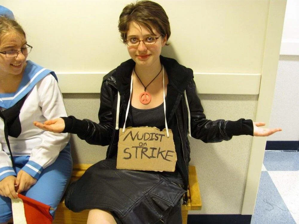 Just wear whatever you would normally wear, write “Nudist on strike” on some cardboard and wear that around your neck. Done. It doesn’t easier then this.