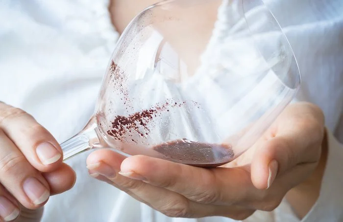 Red wine sediment in glass - image source